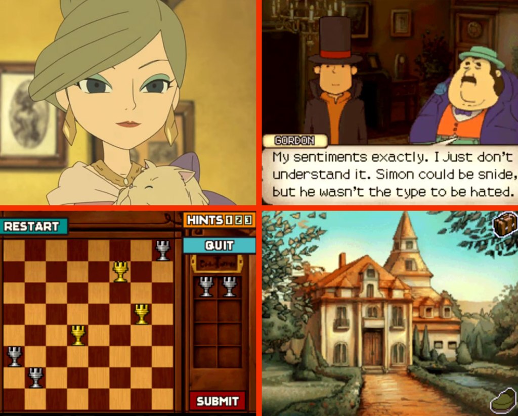 The base of the game plays out like a point-and-click adventure. You enter the town of St. Mystere to find the elusive Golden Apple and acquire its wealth. In the meantime, you are confronted by the townsfolk, who strangely present you with puzzles at every turn. There are 120 puzzles in the main game, with 15 unlocked as Layton’s challenges. There are an additional 25 puzzles available as weekly downloads, but the service has since shut down. These can be unlocked with cheat codes, as they are in the game code. Layton’s Challenges are unlocked by finding pieces to every puzzle. One is sorting items in either Layton’s or Luke’s room, and their reaction is a hint as to whether it belongs to them or not. Another is assembling a gizmo and finding all the pieces to a jigsaw puzzle. These are found by solving optional hidden puzzles outside of the story ones.