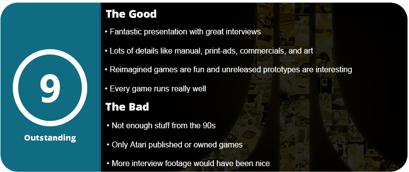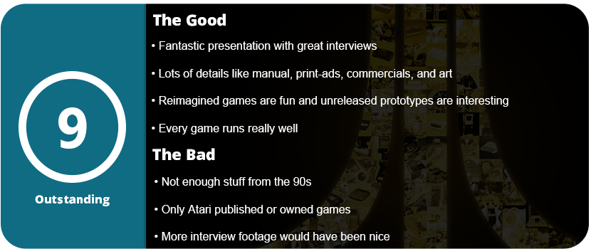 Overall, the Atari 50 is one of the best retro packages you can ever play. Telling an entire developer’s history with games placed in their correct time slots and even including unreleased games and reimaginings of some is just fantastic. The videos are entertaining and interesting, and you will learn a lot. There are so many details added from commercials, print ads, posters, manuals, customizable controls, save states, and more. It’s a complete and cohesive package for Atari lovers out there. Just be warned that there are no third-party games and less of the 90s stuff.
