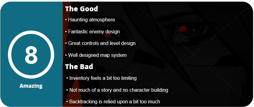 Overall, Signalis nails the feeling and atmosphere of Resident Evil and Silent Hill. The monster designs are great, the music is haunting, and the level design is done in such a way that memorizing the layout of an area isn’t that hard, which is key for games that need a lot of backtracking. Puzzles aren’t insanely vague or obtuse, and it’s obvious what items go where once you find both. I just wish there were more than six inventory slots. It just adds artificial fluff to the playtime by constantly having to go back to your storage chest and dump off items. I also wish the overall story and world-building were better. The game is only about 6 hours long, so there isn’t much time or room for character or world-building anyway. Thankfully, the atmosphere, enemy design, tight controls, and well-designed areas are all tight. This is easily the best retro horror game to be released in the last couple of decades.