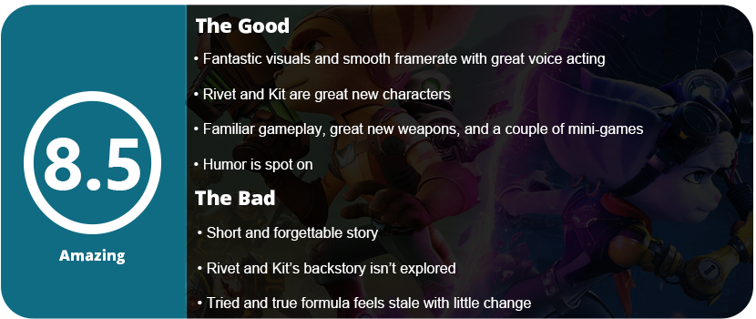 Overall, Rift Apart takes the typical Ratchet & Clank formula and brings it to the next generation with little change or fluff. There are a couple of mini-game segments to mix things up, the characters and voice acting are spot on, and the humor is there despite not being fully pushed this time around. I wish we got a new villain, and Rivet and Kit aren’t explored enough. The story itself is also a Saturday morning cartoon with little depth. The weapons are neat but not well-balanced, and overall, the old Ratchet formula feels a bit stale here despite being perfect.