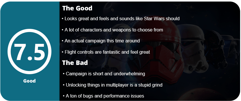 Overall, Battlefront II doesn’t quite live up to the original charm and essence of years past. Multiplayer is fun with huge open battles, but it comes at the cost of a serious grind just to get a single battle card equipped. The campaign is appreciated, but it’s short and uninspired, and Iden’s character is underutilized. Combined with poor performance issues and the loot box scandal at launch, this game is a bargain bin purchase at best.