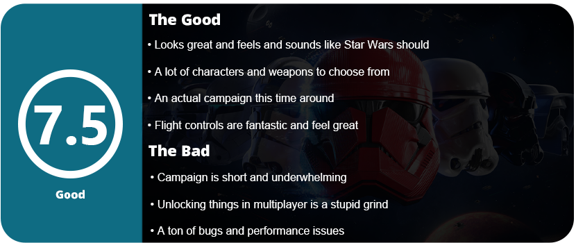 Overall, Battlefront II doesn’t quite live up to the original charm and essence of years past. Multiplayer is fun with huge open battles, but it comes at the cost of a serious grind just to get a single battle card equipped. The campaign is appreciated, but it’s short and uninspired, and Iden’s character is underutilized. Combined with poor performance issues and the loot box scandal at launch, this game is a bargain bin purchase at best.