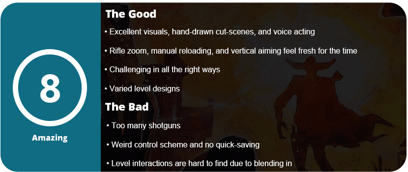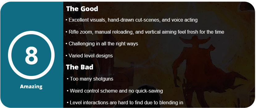 Outlaws is one of the best retro shooters ever made, despite its flaws. The controls are terrible, the game is a pain to get running, and the story is pretty much pointless, but what is good is what matters most. The shooting. I didn’t like how confusing some levels were and how important interactions were easily missed, but these things can be forgiven slightly due to its age and how many things it innovated. Scope zoom, vertical aiming, jumping, great-looking visuals and music, hand-drawn cut scenes, and manual reloading The game is short with only 9 levels, but there were more added for free in Handful of Missions. If you somehow missed out on this classic, then go back and check it out.