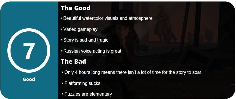 The game starts inside a house, and you learn to interact with objects, complete small and simple mini-games, and gather various objects. Ansya likes to talk to her dolls, and she ends up having her inner dialogue narrated by her mitten, Comrade Mitten, through the journey. As most know, children like talking to dolls and objects that they get attached to. Sometimes this can be a coping or comfort measure, especially after severe trauma. The game changes the pace constantly, going from side-scrolling platforming sections to first-person walking sections and sections in which you are finding objects in small houses. It changes up the gameplay quite a bit, and the game never gets dull. The original Russian voice acting is great, and the overall tone nails the atmosphere of dread during the war.