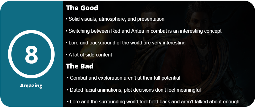 Back in the mid-2000s, there were many God of War clones, and that trend continues with the 2018 reboot. Banishers is essentially a God of War clone, almost to a T, barrowing many elements such as combat, exploration, storytelling, and the upgrade system. However, there’s a hint of “Eurojank” present that I just can’t shake. While the story, setting, and lore are interesting enough (the key word is “enough”), the game never excels to the heights of the game it’s trying to become.