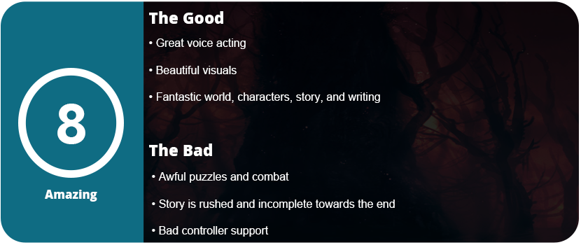 The last third of the game is clearly rushed, and the game obviously wasn’t completed. This section is mostly just cutscenes and dialogue. Kian’s and April’s sections just end with no conclusion, and Zoe’s section is the only branch that feels complete in a way, with a proper cliffhanger for a sequel. I just found it odd that each chapter took nearly two hours to finish, and around chapter 7 I’m finishing them in a matter of minutes, and there are no more puzzles or gameplay. Even for what’s here, 12 hours is quite long for an adventure title. I feel this needed to be 20 to feel fully complete. Thankfully it doesn’t overstay its welcome. The writing is great, the voice acting is decent, and the world and characters are really interesting.