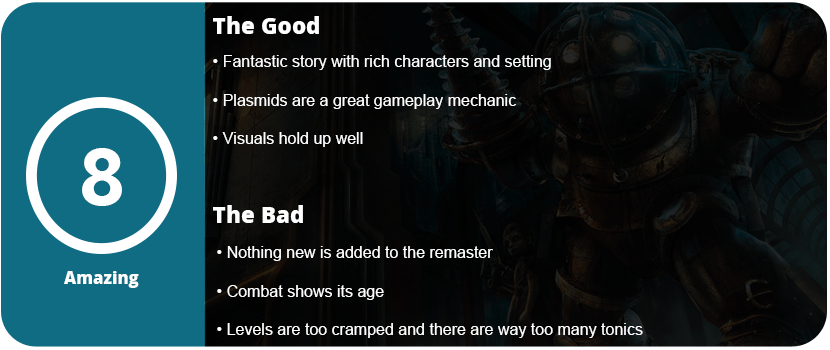 Sadly, the remaster does the bare minimum. Only making the game playable exactly as is, just in a higher resolution and frame rate. 2K Games took the PC version with the updated DirectX 10 lighting and shadows and threw it on consoles. We get developer commentary and some combat trials, but the age of the game is also present. A full remake would have been better. While the story is well known amongst gamers of the HD era, the gameplay hasn’t aged quite as well. There are many quality of life improvements that could have been made. For example, the combat isn’t the best. The reticle is a massive circle, and while guns feel pretty decent, the Plasmids are frustrating to aim. Plasmids like Shock Bolt and Incinerate converge on a pinpoint, and you waste so much Eve trying to hit enemies. There are also an awful lot of passive and combat tonics that feel mostly useless for such a short game.