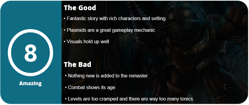 Sadly, the remaster does the bare minimum. Only making the game playable exactly as is, just in a higher resolution and frame rate. 2K Games took the PC version with the updated DirectX 10 lighting and shadows and threw it on consoles. We get developer commentary and some combat trials, but the age of the game is also present. A full remake would have been better. While the story is well known amongst gamers of the HD era, the gameplay hasn’t aged quite as well. There are many quality of life improvements that could have been made. For example, the combat isn’t the best. The reticle is a massive circle, and while guns feel pretty decent, the Plasmids are frustrating to aim. Plasmids like Shock Bolt and Incinerate converge on a pinpoint, and you waste so much Eve trying to hit enemies. There are also an awful lot of passive and combat tonics that feel mostly useless for such a short game.