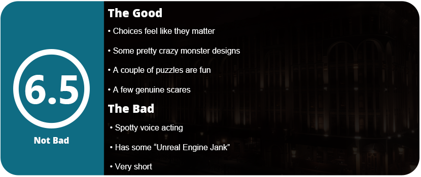 Indie horror games are not always great. In fact, most are pretty bad. There appears to be a trend of focusing on going viral instead of earning positive word-of-mouth through genuine quality. Either relying on tropes such as the “meme monster,” like Poppy Playtime, or having convoluted lore, like with the SCP series. The Inn-Sanity tries to be a self-contained horror title only trying to be good. It’s one of the better “Unreal Jank” horror titles I have played with the, probably by now, overused PS1 graphics aesthetic that mostly misses the point of them. You play as someone who visits an Inn (Sanity Inn…get it? Ha, ha). During the night there seems to be a Cthulhu mythos-style end-of-the-world scenario. You end up meeting a goth girl, who has the only voiced lines in the game, as you both try to survive the hotel and get to the roof while working with a security guard who is always hiding in the security room in the lobby. You only get phone calls from him. There’s also a monster lurking in the hotel, murdering everyone.