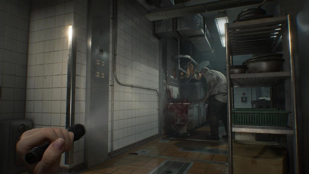Grace’s sections are all about atmosphere and scares. There are no real jump scares here. Capcom did an amazing job delivering a lot of tension through the lighting and mood around you. Harsh white walls may seem like a safe haven, but just beyond the next door is complete darkness and zombies wandering around. Grace isn’t powerful, and her resource management is much tighter than Leon’s. In the first area every bullet counts, and you usually have to run away from most situations. I don’t want to dig too deep into the story and spoil anything, but Grace is investigating the hotel that you are in during the first part of the game, and while the overall layout may seem small, it feels huge when you can only advance little bits at a time. A fight with two zombies will feel like a herculean effort compared to Leon’s sections, who can battle a dozen or two at all once. Grace has a single pistol during her entire time in the game, and you have to acquire other things through crafting. You create things with scrap and blood. Blood is gathered with a tool that you acquire a little ways into the first area. You can craft healing items, ammo, Molotovs, and Hemolytic syringes to keep zombies from coming back to life. Yes, they come back here. Unless the heads are destroyed, that is, and Grace isn’t powerful enough to really do this on her own. It’s story-related, but the syringes cause the zombies to essentially explode. It’s important to craft as many as you can and get downed zombies before they even come back because they can come back stronger as blister-head zombies. These are fast-moving and tough to take down. A single blister head obliterates your ammo and health reserve and is hard to run from.