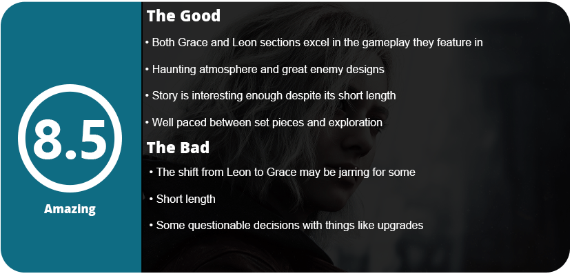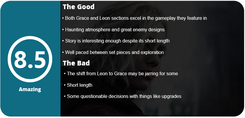 Another aspect Requiem shies away from is less of the campiness from previous games, even VII and Village, which is a welcome change. While there is some cheesiness from the series that eeks in from some of Leon’s lines or the personalities of a few characters, the more serious nature of the series is a welcome change and works well here. While new character Grace isn’t my favorite in the series, she has enough humanity and personality (such as her stuttering a lot when she’s scared and nervous) to help bring the game closer to something more relatable. There are subtle touches in the game that a lot of people might miss, such as Grace holding her mouth when a boss character snakes by, her fumbling a lot when desperate, and little gestures that make a difference. Her sections are played in first person (and optionally third), so you are more up front with the horrors around. Requiem plays like two separate games, and it may be jarring to some. There will be a divide with fans of the slower-paced games loving Grace’s part and fans who love RE 4-6 preferring Leon’s more action-oriented parts. I feel they complement each other. When things start to feel a little too slow, you switch to Leon, and when things might feel a bit repetitive there, or you need a break, you end up back with Grace. Both Leon and Grace have three large parts of the game each that they star in. Most of Grace’s parts are in the first third of the game, giving you brief tastes of Leon’s sections through the first third.