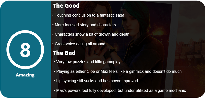 The game does a great job with worldbuilding by having you exmaine objects and listen to Max’s internal monologue. This was unique to Life is Strange and helped you connect with the small details of the world. Various media that characters like, art, school happenings, things like lunch menus. It’s all optional, but helps pull you in. With that said, Reunion is a fantastic ending to the trilogy. Not the groundbreaking finale I wanted, but Deck Nine did a great job. Despite how long it took them to get up to speed with DONTNOD’s storytelling quality, what’s here is great. We grew up with Max and Cloe and finally can see the end of their saga. There are many moments like in the original game with parties, school issues, and more adult issues that break away from the childhood antics of the original game. Life is Strange does something that a lot of games struggle to do. Make their characters feel human and personal.