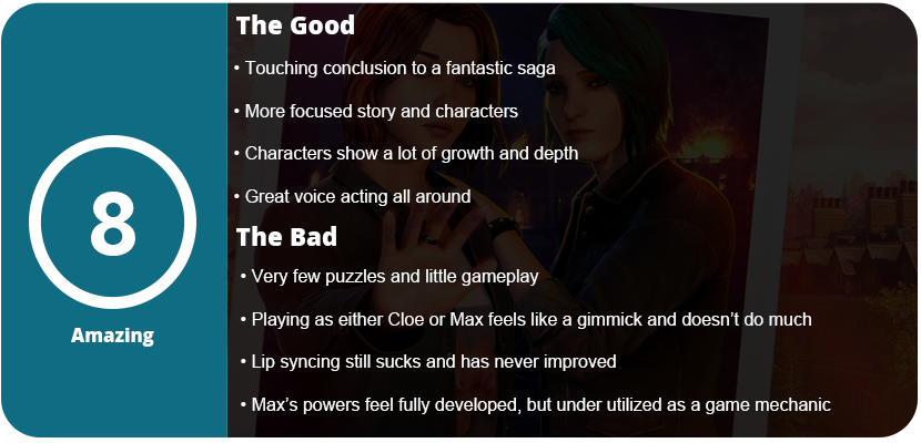 The game does a great job with worldbuilding by having you exmaine objects and listen to Max’s internal monologue. This was unique to Life is Strange and helped you connect with the small details of the world. Various media that characters like, art, school happenings, things like lunch menus. It’s all optional, but helps pull you in. With that said, Reunion is a fantastic ending to the trilogy. Not the groundbreaking finale I wanted, but Deck Nine did a great job. Despite how long it took them to get up to speed with DONTNOD’s storytelling quality, what’s here is great. We grew up with Max and Cloe and finally can see the end of their saga. There are many moments like in the original game with parties, school issues, and more adult issues that break away from the childhood antics of the original game. Life is Strange does something that a lot of games struggle to do. Make their characters feel human and personal.