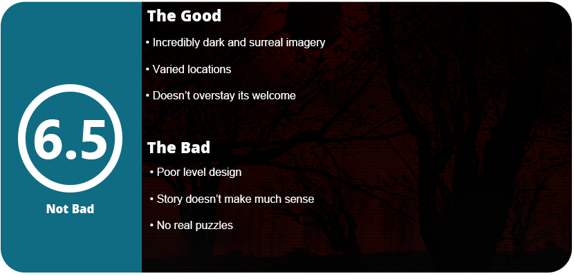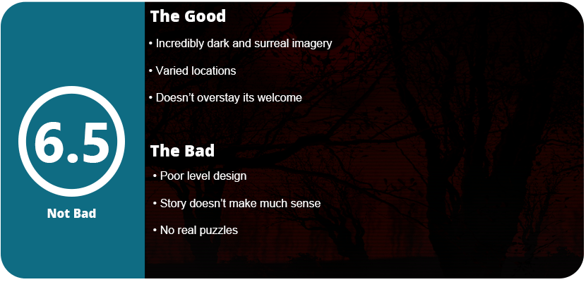 The game doesn’t overstay its welcome. Only a couple of hours long, but the later maze-like levels may frustrate players into a refund. Unless you love the aesthetic and gore that the game provides, there isn’t anything else worth looking into. With that said, the game also deals with suicide and mental illness in some interesting ways. This isn’t the game I’m looking for, but it’s kind of close. For the small entry fee you’re looking at an entertaining afternoon.