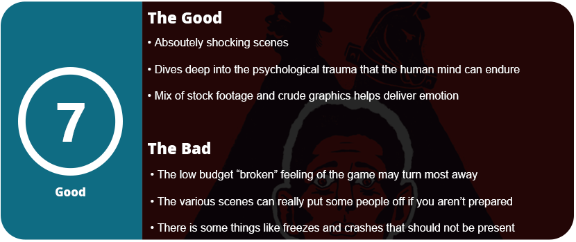 There are certain amounts of censorship in the game, but it’s deliberate, or at least I think it is. Not in the common sense of censorship to appease various people, but for the story. The genitals and breasts of the “horses” are pixelated, and I think this is important to talk about. When you are traumatized by something, you tend to see things differently or block them out of your mind. Certain torture scenes are blacked out, or the camera is positioned in a certain way to not show everything, but done in a clever way to still know what’s going on. It’s crude but very effective, and all done purposefully to give the player a certain feeling or emotion. There are also stock footage clips of close-ups from real life, like when you drink milk, it’s a close-up of a throat gulping, and a crude sound effect plays. The opening menu is stock footage of a flower with music playing in the background, similar to some analog horror games we have seen.