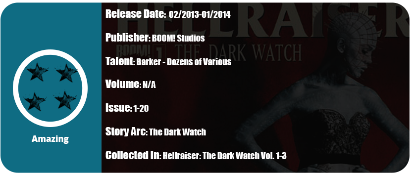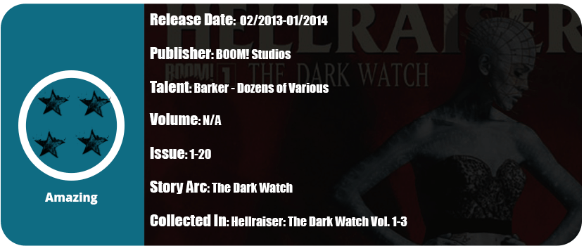 Hellraiser is a fantastic series with great lore and characters. The visual style is what’s most appealing about the franchise, with its gruesome deaths and interesting and horrific character designs. Clive Barker is one of my favorite horror authors, and Hellraiser is right up there among my favorites. The Dark Watch takes a different approach to the series, rather than a bunch of mini-stories. The Dark Watch consists of 12 issues that have an overarching story.