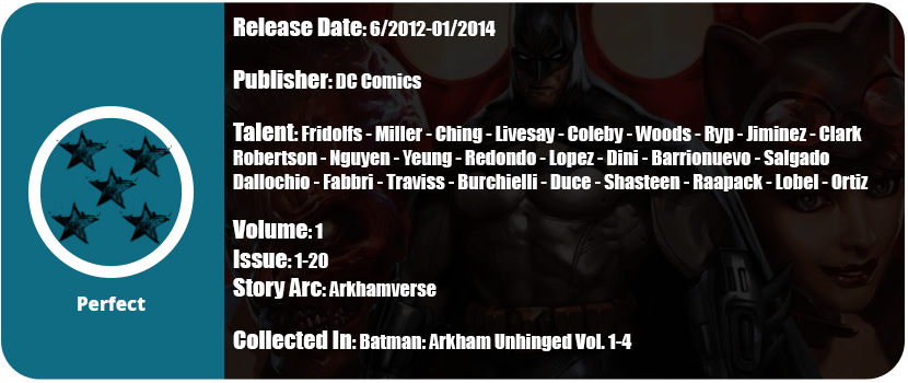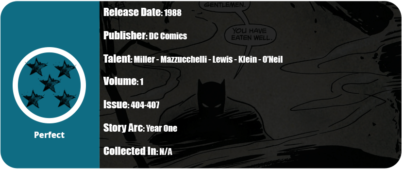 The last issue is about the origin of Man-Bat. A science experiment went wrong, but there’s quite a bit of detail here. He sacrifices something to do this and in the end, it turns out it wasn’t a good idea. There are some awesome shots of Batman in the shadows and a great full-spread shot of him fighting Man-Bat. The art here is great and much improved over Ivy’s and even Riddler’s issue. This origin story comes to a full circle beginning and conclusion in about 50 pages and I was really entertained. My guess as to why this is recommended to be read so close to Year One is how Batman is still not fully integrated into his role and is still trying to find tech to use to increase his fear among enemies.