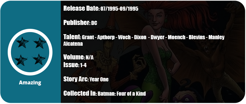 These four annual issue tie into Year One of Batman, and they are also one-shots. I have mixed feelings about this collection as three are origin stories and one isn’t. Poison Ivy’s issue isn’t all that interesting. It’s full of cheesy 90s comic dialog and is just a single conflict between her and Batman. It’s strange that her origin story isn’t in here, but Scarecrow and Riddler’s are. We also get the origin story of Man-Bat from the Legend of the Dark Knight series.