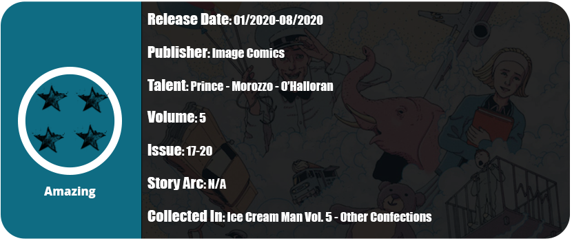 By issue 20 and five volumes in, I really like Ice Cream Man. The sick and twisted individual stories tell real down-to-earth problems that humanity faces daily and that some of us may have faced, and nothing ever has a happy and fun ending. I just want more of ICM’s story. All of these individual people he’s messing with tell great stories, but I want to know why.