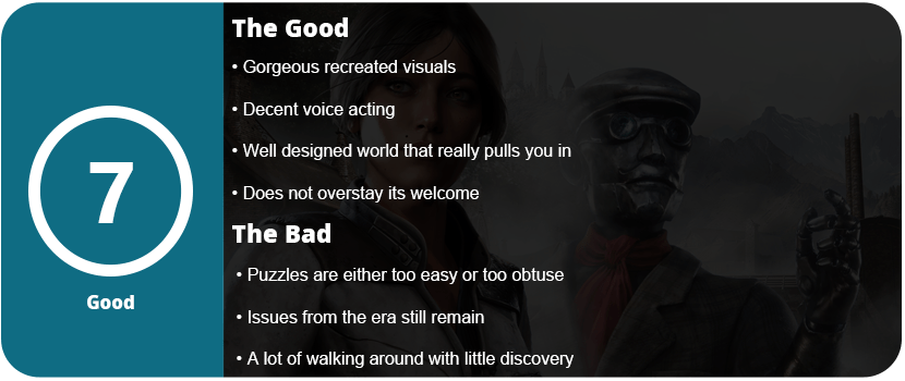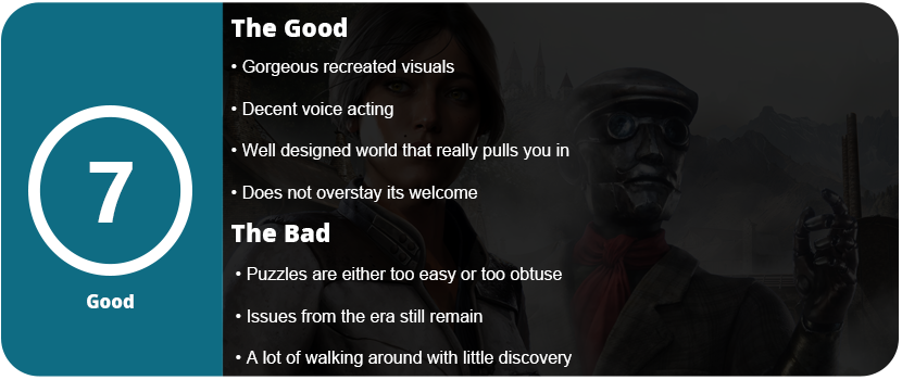 Despite not being ported over to a new Unreal Engine, the UE3 assets hold up surprisingly well thanks to the fantastic Art Deco style the game went for and have become iconic. The visuals were state of the art at release, but just increasing the resolution doesn’t do much here. The hacking mini-game gets old fast (assemble pipes) and could have been changed or removed. The enemies and characters are also well designed and iconic, but the game has definitely aged. Some areas are not so graceful, such as the combat, level design, and RPG elements. Enjoy the game for a fun evening that’s a great roller coaster ride and explore. Don’t focus too much on collecting, and just enjoy this as a stylish shooter.