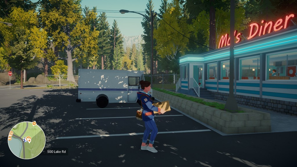 You start the game off with a little backstory. Your mail co-worker, Frank, picks you up from the airport and drops you off at your parents’ house. You then start your delivery the next day. This is actually quite fun at first. You drive your mail truck around the small town and drop off mail at mailboxes and packages at doors. You get a map with envelope icons for mail and box icons for packages. It’s not too hard to figure out, as there are very few roads and you can’t get lost. There are certain landmarks in which story characters reside, such as Mo’s Diner, Kay’s house (a childhood best friend that you lost contact with), a lumberjack who is trying to prevent corporate apartments from being built, a potato farmer, a teenage mechanic, a general store owner, and a movie rental store owner, and you get to decide what your relationship is with these people. You can fall in love with them, ignore them, or just stay neutral. This is a story about everyday life, and while the characters aren’t very interesting, the overall bigger picture of small-town life is what can drive you in.