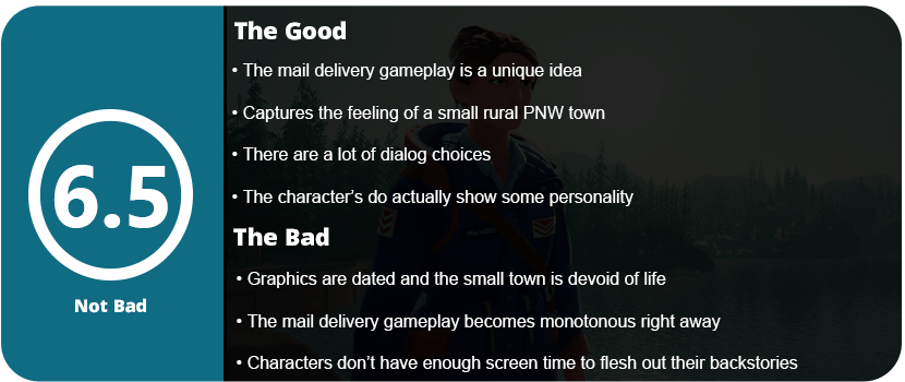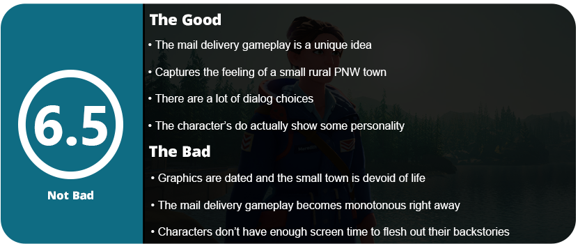 Overall, you’re not missing anything by not playing this game. The mail delivery mechanics are unique and new, but they aren’t fleshed out enough to stay interesting. The town is too small for a gameplay loop like this, and there needs to be more variety in the 12 days of mundane mail delivery. While the characters do have unique personalities, I didn’t care about them enough to really let my choices sink in. There’s just not enough screen time with them. Just as they start to blossom, the game ends, despite the number of choices available to you to weave your own path. The game does capture the sleepy rural PNW feeling, but the small area is just devoid of any life.