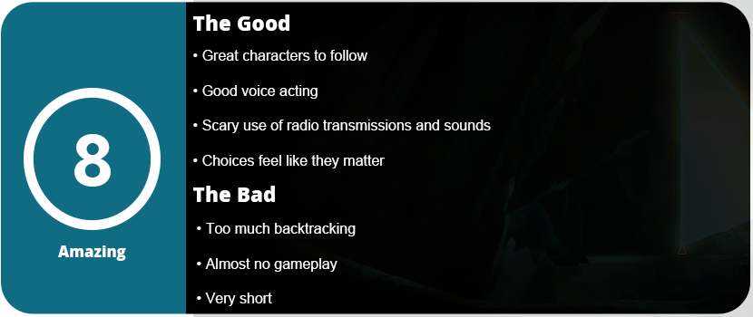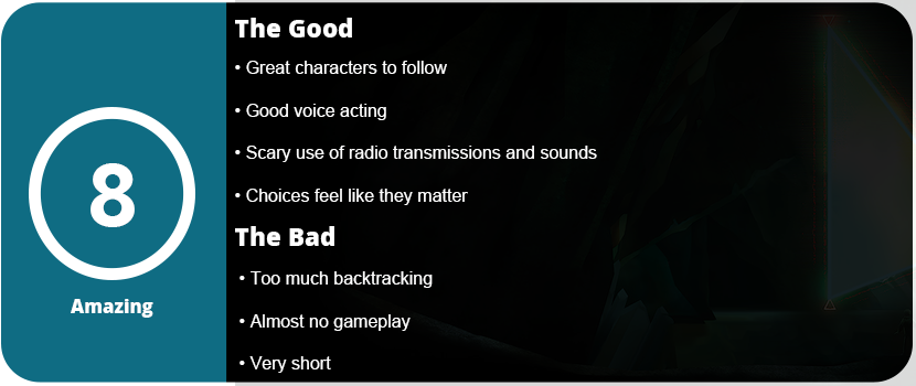 Overall, Oxenfree is a great horror mystery game that, while not very memorable, will entertain you for an afternoon and might be something you discuss with friends as the story does have a twist ending. It looks good, has great voice acting, and the characters are interesting, but the constant backtracking, slow pace, and almost zero gameplay may put some off.