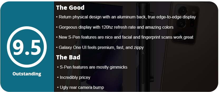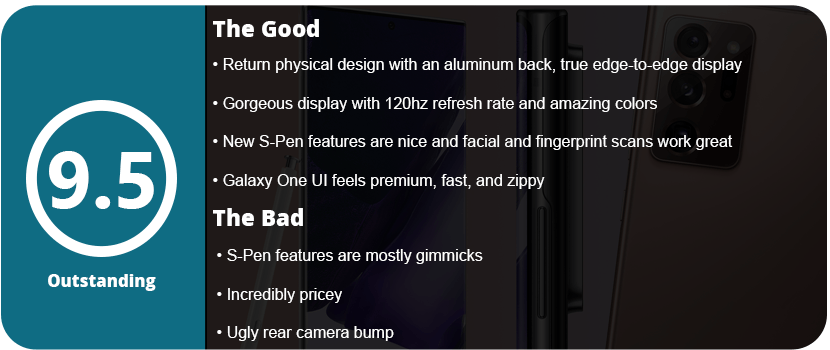 Overall, Samsung has created the most premium Android ecosystem on the market, and the Note 20 reigns supreme. With a 108MP camera, themes, an always-on display, tons of battery-saving measures and options, the best OLED phone display on the market, Dolby Atmos speakers, a 120Hz refresh rate, a true edge-to-edge display, and the return of the aluminum back, the Note20 feels like it has returned from a long run of being a copycat instead of staying true to form.