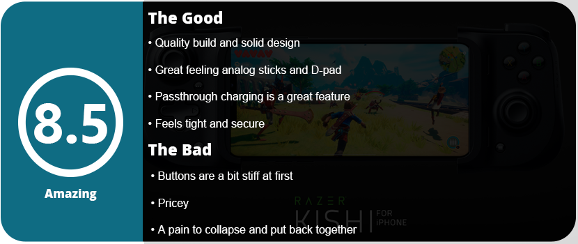 With that said, there’s not much left to say. There is an app that upgrades the firmware, but mine didn’t need it. Other than that, if the game supports controllers, it will recognize this device. I have yet to play a game that supports controllers that won’t see the Kishi. The only issue was Real Racing 3, but there’s been a long-time glitch that requires you to put the game in airplane mode to use controllers, so that’s not Kishi’s fault. For the price point, you’re paying for quality, and this is well worth $100. I know console controllers are $40 cheaper, but this thing is a bit more complicated to make and has more moving parts. I think it’s well worth the money, and it turns your iPhone into a portable handheld gaming device.