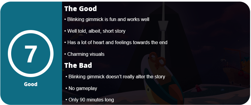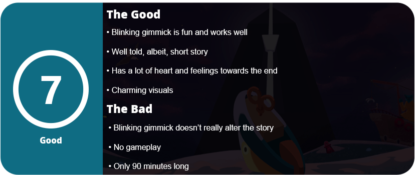 Overall, Before Your Eyes is a charming game with a lot of heart and a fun gimmick that works well when it wants to. It’s a very short game and doesn’t let you really connect with the characters enough. It’s forgettable in the end, and not as memorable as some other short adventure titles I’ve played in the past, but it’s fun and worth a look.