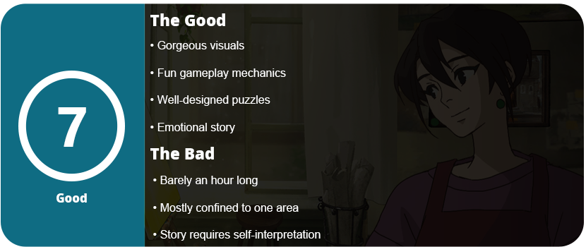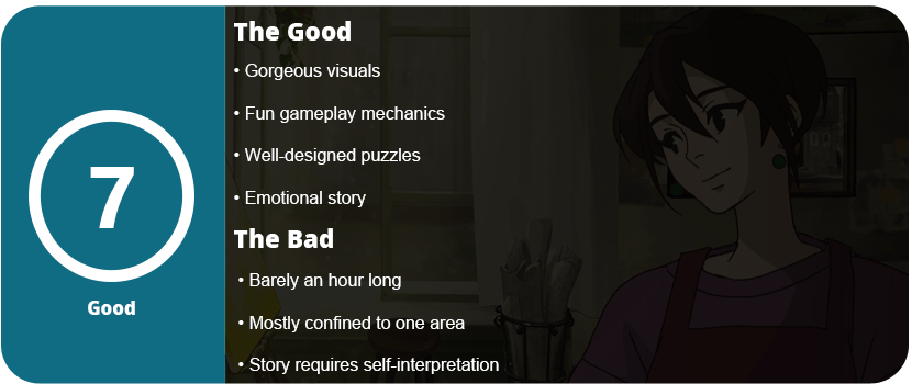 There isn’t a lot of context on the main character’s life itself through any reading of notes or anything. It’s pretty much learning about her past and her connection with her neighbor. The game has gorgeous anime-Ghibli-inspired art with a few small cut scenes thrown in. I never got tired of looking at the game, but it is confined to mostly her apartment. Every so often you “dive” into a painting, but it’s usually just for story context. There were a few panoramic scenes that were breathtaking. I actually felt like I stepped into a painting myself a few times.