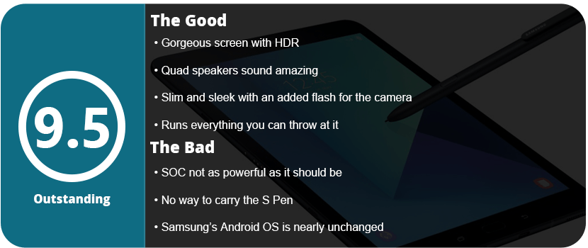 Overall, the Tab S3 is a fantastically powerful and feature-packed tablet. It’s a worthy upgrade from the S2, or if you want an all-new tablet, this is a great one to jump into. With a gorgeous screen, HDR support, a versatile S Pen, quad speakers, and a slim design, there’s nothing wrong here at all. While the SOC isn’t as powerful as I’d have hoped, it’s not enough to deter me from recommending it.