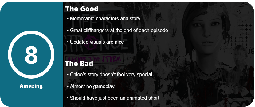 Life is Strange is one of my favorite games of all time and one of my top adventure games. The atmosphere, music, characters, writing, and story all made me feel nostalgic to be a rebellious teenager again, and it seriously sparked my imagination long after I finished playing it. Before the Storm pulls us back to Arcadia Bay as Chloe Price and helps us see who Chloe really was before the events of the first game.