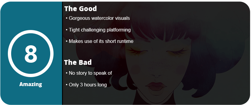 While the game lacks in story, it makes up for it in gameplay with challenging platforming, some puzzles, and a gorgeous watercolor art style that is just a joy to look at every second you are in the game. This is Gris’ main draw: his eye-catching art style. I wanted to know more about this mysterious girl, but we just got platforming instead. Oh well, as it stands, it’s a must-play for fans of games like Journey or The Unfinished Swan. I had a blast, and while the game itself wasn’t memorable, the art style is striking enough to remember.