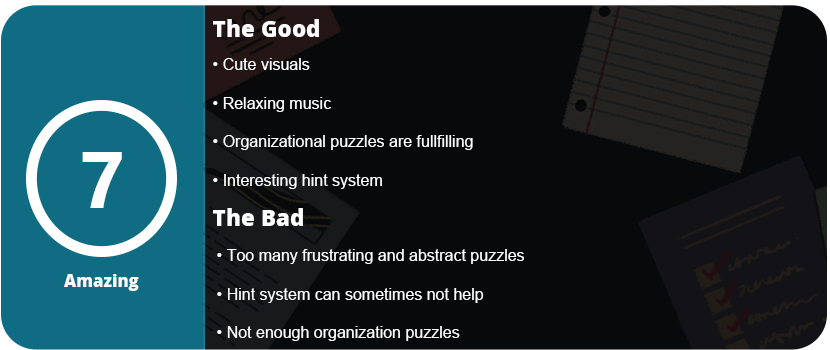 The visuals are cute. It has a pastel, minimalistic look. Lots of colored pencils, charcoal, and watercolor art designs The music is great and relaxing to listen to in the background; it’s just too bad the game isn’t as relaxing. In the end, A Little to the Leftis misleading in its first dozen puzzles and quickly ramps up the abstractness and obscurity too much, requiring too many puzzles to be skipped. The most enjoyable ones are too few. This isn’t a bad game at all. There are fun puzzles peppered throughout the bad ones, and the overall cat aesthetic is enjoyable with great music.