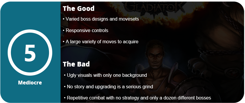 Overall, Rage of the Gladiator is a repetitive, boring, easy, and weak attempt at a genre that has been done better and to death. There’s no rebalancing of the shop or winnings, so you’re grinding as if you can buy these things to advance quicker. The bosses are uninteresting and boring, the game is ugly and drab, and there’s no story to speak of. Shoving a mobile game onto the 3DS was a bad move, and it shows here.