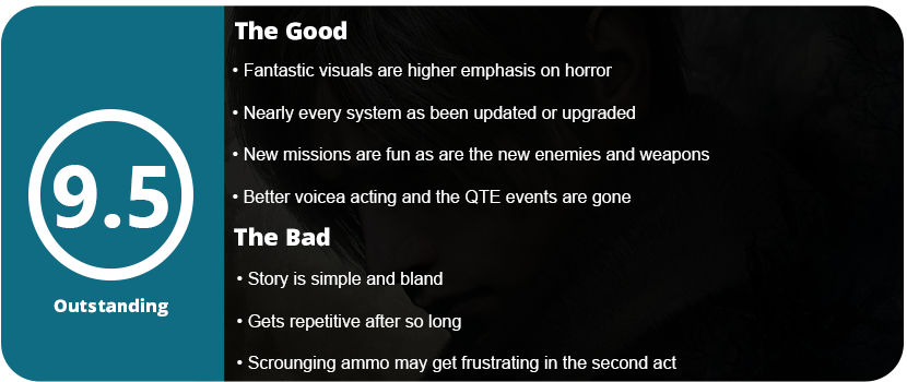 The visuals are a nice upgrade over the previous remakes. Ray tracing has been added, but it’s not great. The RE engine is still insanely well-optimized for lower-end PCs and runs really well. However, there is still no DLSS support so it needs to be manually added through a mod, but even on the Steam Deck, the game runs fairly well. The visuals are top-notch and the art direction captures the vibe of RE4 in a more visceral and raw way. I love it. When you’re all finished with the game you can run through on a New Game+ which is a must as that’s the more fun way to play. Overall, RE4 (2023) is a massive update to an already iconic game and changes nearly everything wrong with it. I just wish the game was a little better balanced and it does get repetitive after so long. You are just walking around shooting zombies with a couple of simple puzzles thrown in. At least the exploration is fun and there’s always something new to look at.
