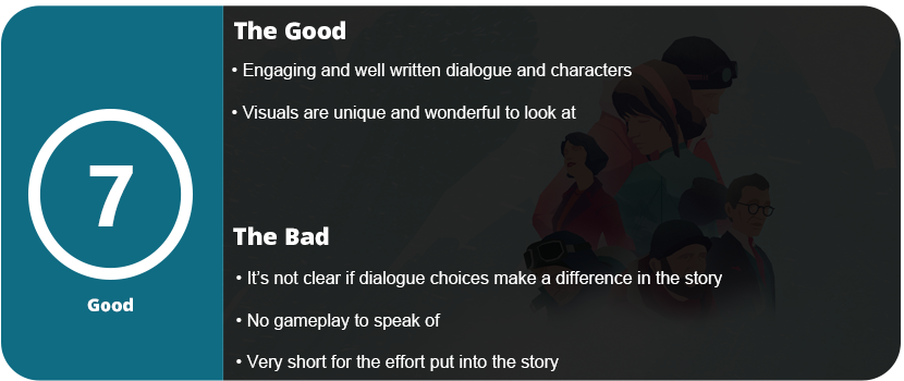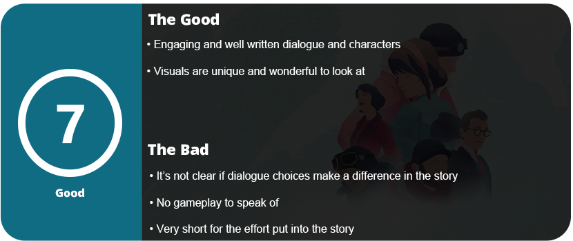 Overall, South of the Circle provides an entertaining, well-acted, and well-written story and script, but the lack of gameplay makes you question whether this is just enough here to be an excuse for a game. The art is fantastic, and the motion capture is enticing. I wish the dialogue choices were a little more obvious about what they did or if they changed anything at all.