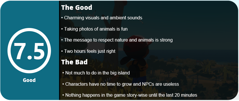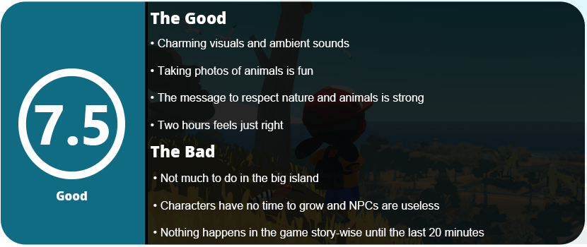 I did enjoy taking photos of the animals, as tracking them was a lot of fun, but sometimes there is just one bird you can’t find somewhere to complete a side objective, and it’s quite irritating and frustrating. While the idea of respecting nature and animals is a great message to get across in a game, I felt nothing for the characters as there wasn’t enough time to do any world-building. For most of the game, you’re just trying to get the 50 signatures, and nothing really happens until the last 20 minutes of the game. For such a large island, I felt there could have been more to do with maybe some mini-games or more side objectives. Even adding more animals that aren’t 90% birds would have been nice as well. Animals are categorized as rarities, but I don’t see how this has any bearing as there’s no point or rating system for finding these animals. Hell, there isn’t even an achievement for finding all the animals in the game!
