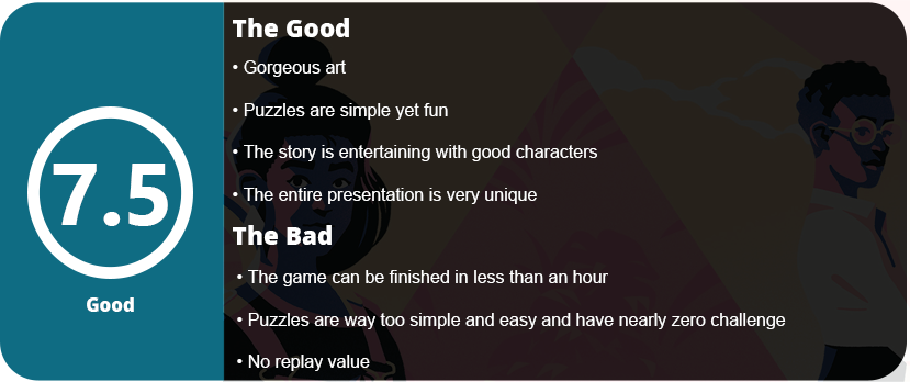 In the end, the game is over in about 90 minutes or less depending on how long it takes you to solve the more complex puzzles in the final chapters. Without having to solve these this game is over in an hour. The story does unfold quite a bit towards the end and without voice acting it gets a lot of emotions across and I have to give the developers credit for that. Most of these short indie games don’t have any meaning behind them. They have some clever gameplay ideas or neat visuals and nothing beyond that. Behind the Frame actually tugged at my heart strings a bit and got me thinking at the end which is more than I can say for 60-hour-long AAA titles. If you want a puzzle-filled emotional evening with great visuals and fun gameplay mechanics then look no further.