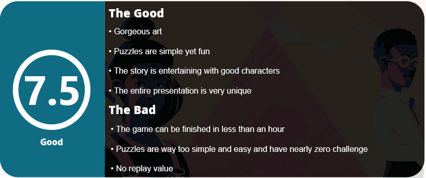 You’ll most likely not really feel the game’s impact until the last 20 minutes when things get really dark and sad. It didn’t make me tear up, but it was really sad for sure. You can finish the game in about 90 minutes, but I did connect with the character to an extent, but not wholly. The scenes rush by too fast and you’re meant to understand the moral of the story more than connect with the characters and get behind their motives and feelings. I feel a game like this misses the mark due to its short run time, but the gimmick would get tiring for more than 90 minutes.
