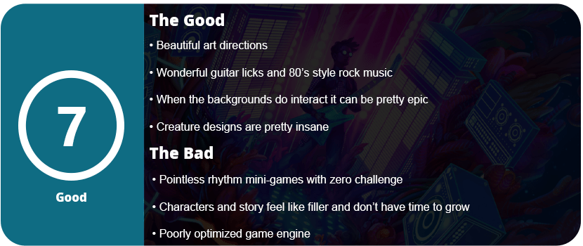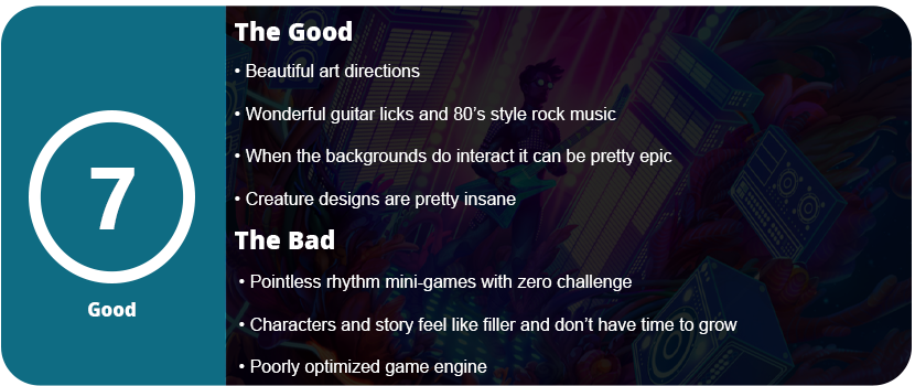 At the end of each stage, you come across a boss of sorts that displays a Simon Says-style rhythm pattern. There’s zero challenge here, as you don’t need to memorize anything as you can play as the buttons appear. You also don’t get penalized for messing up, and that note just starts over. I found this mechanic fairly pointless and just filler, as some of these sessions are only a few notes long. It sounded and looked cool, but that was it. There’s pretty much zero gameplay here. The sidescrolling and shredding are literally an excuse to turn this story into a game. I also loved the art. There are crazy creature designs and lots of vaporwave aesthetics going on, with a multitude of lights and colors all over the place. Sadly, that’s all the game really offers. While the voice acting is also good, the dialog isn’t anything exciting, and I didn’t care at all about any of the characters. The game is so short that you don’t get any time to really invest in these characters.