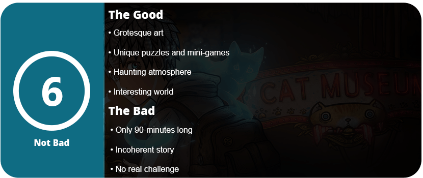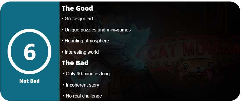 I love short point-and-click games, but they are hit-and-miss. For these games that are less than two hours, it takes a lot of talent to pull off a good story, something to get attached to, and fun gameplay. Cat Museum nails almost all of this except the story and something to get attached to. The mini-game and puzzle-driven gameplay are more entertaining than pixel hunting, but there’s also the fantastic art direction and grotesque nature of the whole game.