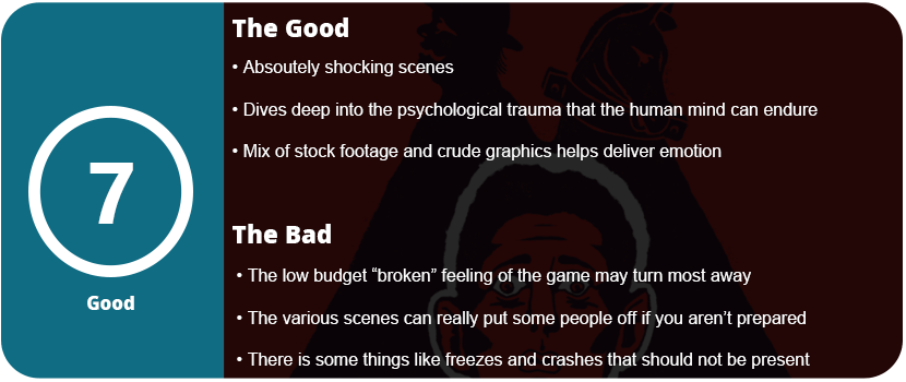 I don’t want to spoil the story too much, but I have to talk about some of the actual shock that comes from the various scenes in the game. The warnings when you boot up the game are not to be taken lightly. This isn’t some PR or HR department giving you a silly little warning. You will be partaking in torture, cutting off genitals, whipping, burning, branding, and riding these “horses.” You’ve seen the game trailer and know these are people, not actual horses. It’s more than just shock value, but we are diving into the mind and dark past of this farmer. This is a story about abuse, being a victim of it as a child, and not being able to escape that. Unchecked mental health issues going rampant are something that is a major problem in our world, and this game really shows that. Nobody is talking about this game outside of mainstream articles about the ban because it makes you uncomfortable. Those who aren’t uncomfortable by this don’t talk about it because they don’t want to be judged. This is a piece of media that everyone knows or hears about, but acts like it’s not in the room with us.