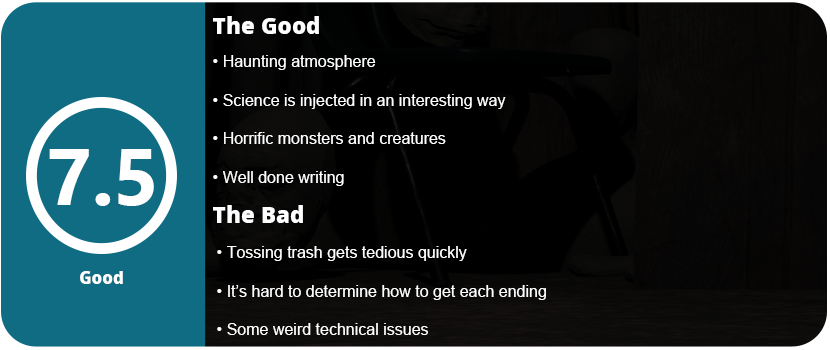 The atmosphere in this game is nailed perfectly. From the foreboding and haunting music tracks to the way lighting is done, it is subtle but really pulls you into the experience. For such a small indie title with pre-rendered screens, it’s astonishing how well this is all done. This is a point-and-click adventure game, so you naturally move around the half dozen screens or so and explore. The girl is originally sent down to clean up trash after her grandfather passes away, but the trash keeps regenerating, and you end up finding other things. There are puzzle elements involved, and you soon find out that your grandpa was a scientist experimenting on genetics in the basement. You uncover many science docs explaining the backstory and what was going on down there, as well as some truly horrific photos and images.