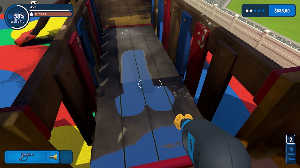 Every surface is covered in dirt, rust, mud, or some type of grime. You get a power washing nozzle and you spray things down until they turn clean. You can decide what to spray, what direction, and in what order. That’s part of the fun. Tackling each area in a certain way is satisfying and fun for you. Your tools include various spray nozzles that have different widths as well as spray liquid for getting tough areas, but this stuff is expensive and limited. You also have a spray gun that shoots various distances. These can be bought and unlocked with money by completing levels. You are paid at the end of a level and you can see a sped-up replay of your work. There are also cosmetic items such as your suit and gloves.