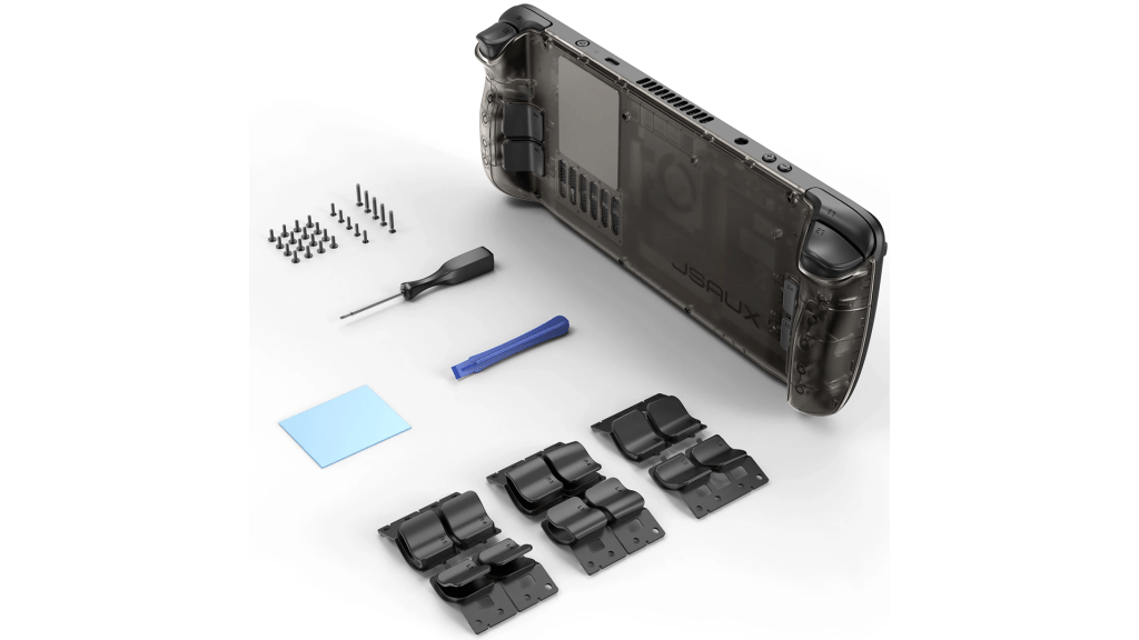 Jsaux, despite being a nobody, took the shot to be the first third party to produce high-quality Steam Deck accessories. It all started with their original dock, and now they have over a dozen accessories available. Their latest and first accessory to modify the deck itself is a transparent back plate. These are high-quality injection-molded plates that feel just like the OEM plates. I was honestly shocked at the quality. They also feature a metal plate with a thermal pad that goes over the APU housing, which the original plate doesn’t have. This keeps heat in one area and away from the back of your hands, which would normally start sweating.