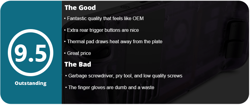 You get a lot of stuff in the box. There is the plate itself, along with three different types of buttons. The standard rear buttons are installed, but you get buttons that raise up and away from the plate, so you have less travel to press the buttons. There are low-height and high-height buttons. I actually like the low height, as I don’t have to squeeze the deck so hard to press the triggers. You also get a screwdriver, a plastic pry tool, extra screws, and some weird anti-static finger gloves, which are stupid, completely pointless, and a waste of packaging. Sadly, the screwdriver and pry tool are garbage. The pry tool broke during the first use, so I had to use a flathead screwdriver to pry the back plate off. The screwdriver is made of very soft metal, so the driver head strips really easily. Thankfully, I had my trusty iFixit kit handy instead.