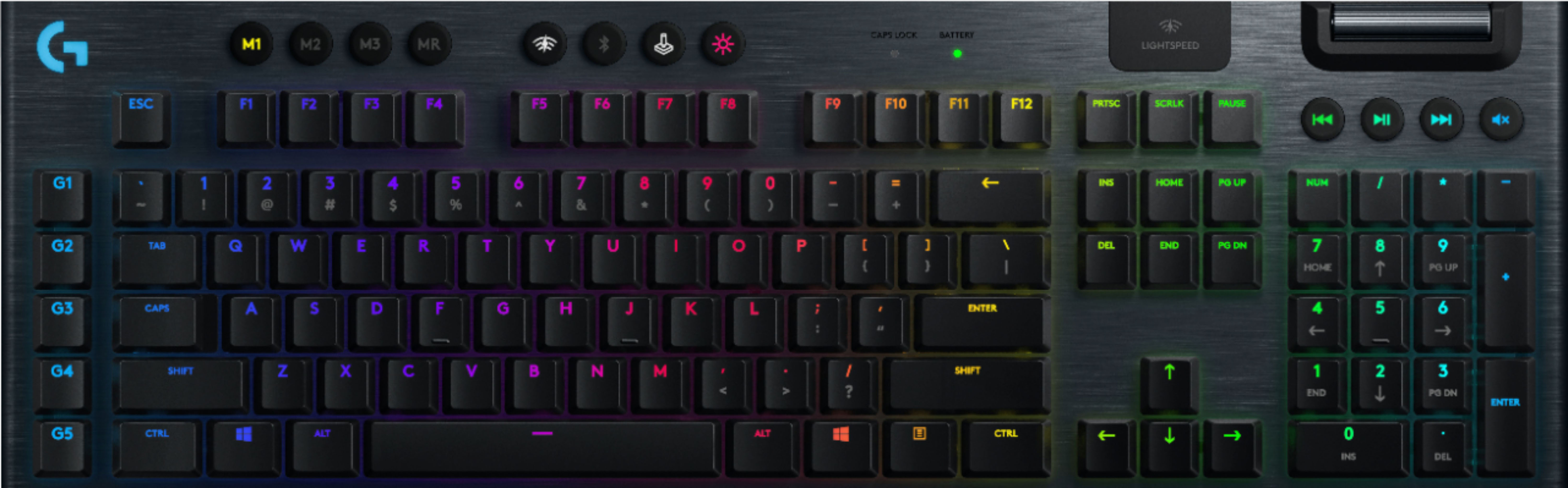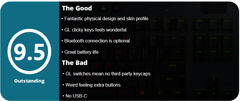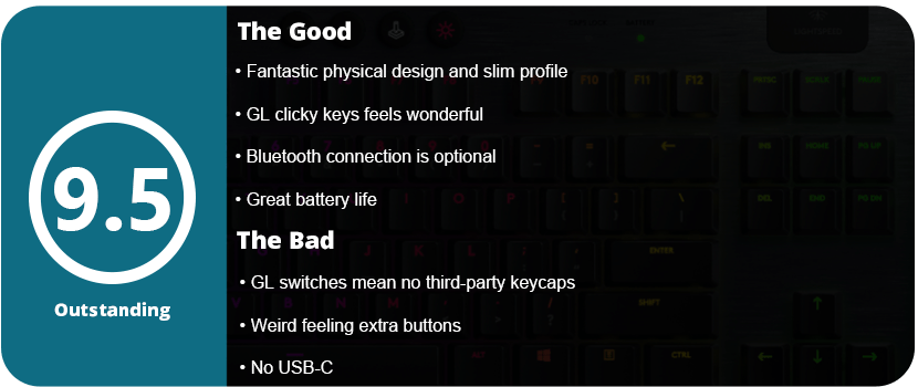 Overall, the G915 Lightspeed is a fantastic keyboard. The slim profile, brushed metal, and fantastic clicky GL keys feel really nice. I wish the extra buttons were more tactile and not a squishy velvety rubber, but at least they’re there. There is also no palm rest which is surprising for the premium price you are paying and it’s not USB-C. I’m impressed with the battery life quite a bit and overall it’s just an incredibly solid keyboard and is a delight to type if you like clicky keys.