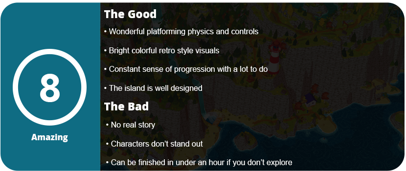 Even after reaching the peak, you get an opportunity before finishing the game to complete everything. By the first full hour, I had almost all the feathers, and I could go anywhere I wanted. I didn’t 100% play the game, but I got close to it. The platforming itself is wonderful, with great physics and tight controls. I never felt slippery, and gliding never felt off or wrong. You do eventually get a sprint ability, and this helps you get around the island even faster on foot. Thanks to the short length, there’s a constant sense of progression with every action you take. The visuals are bright, colorful, and charming, and the music is fantastic. There’s not much to hate about this game other than its length and lack of an overall story.